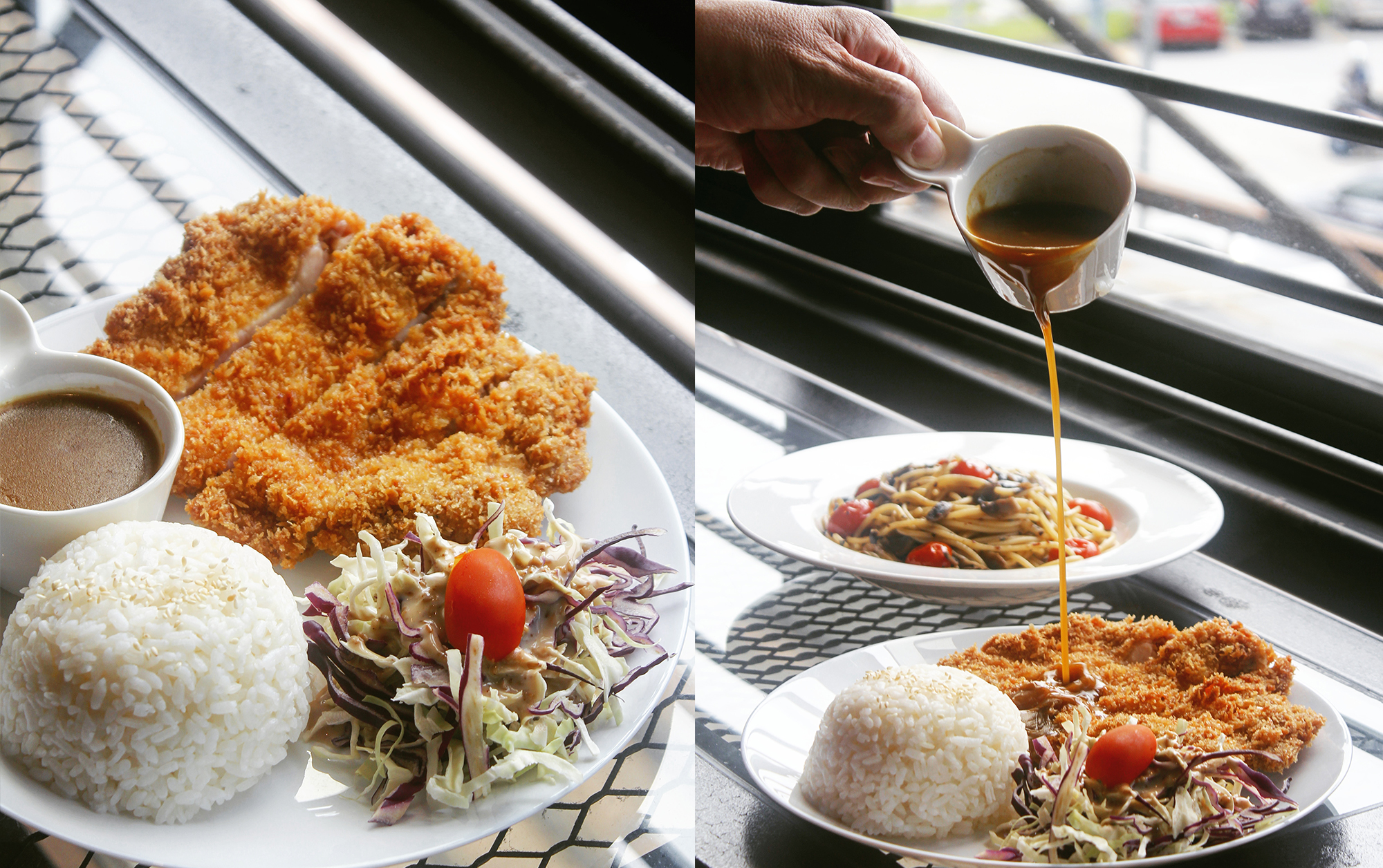 Crispy Katsu chicken deep-fried till golden brown served with a bowl of warm rice and salad.
